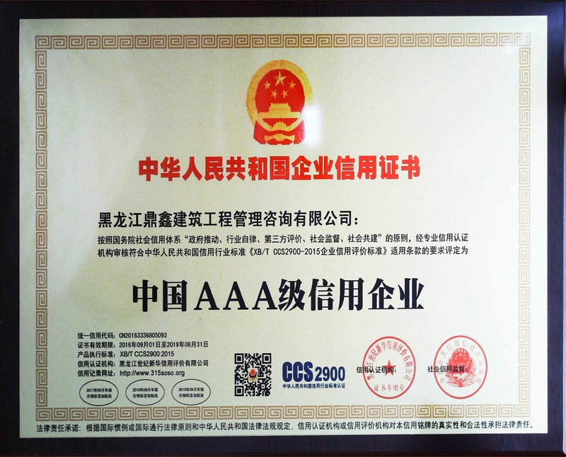 中國AAA級信用企業證書